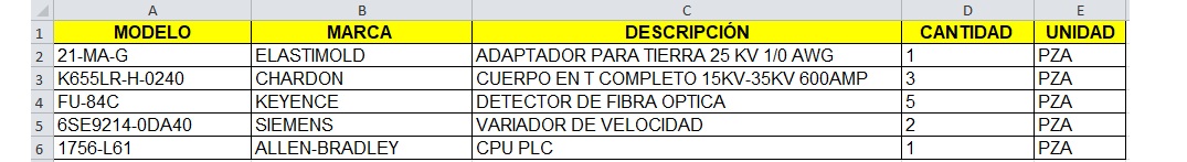 2. LLÉNALO como se muestra en el ejemplo de abajo, con los datos de todos los productos requeridos, indicando para cada uno: MARCA, MODELO, UNIDAD y CANTIDAD REQUERIDA. Una vez que hayas terminado de llenarlo, GUÁRDALO en tu computadora.